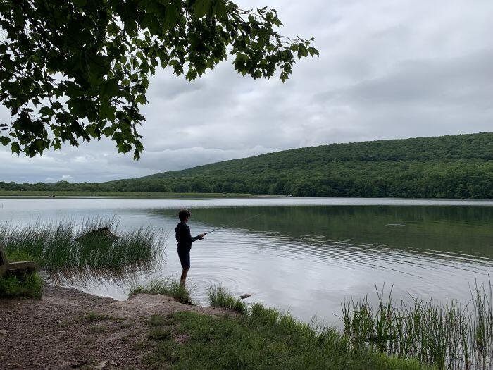 Locust Lake is small, it feels more like a pond, with a beautiful hillside view as a backdrop. There is a beach area and lots of good fishing spots, including at campsites on the water’s edge and just off the trails that surround the campground. We easily found a nice spot to ourselves (with two benches!) to drop a line.