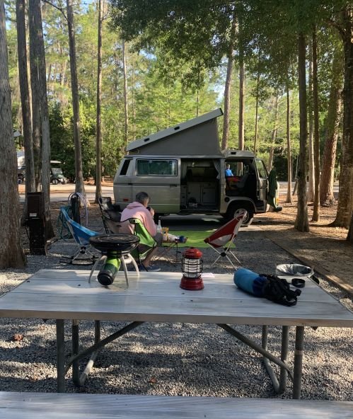 You will find impeccably groomed campsites, clean restrooms, beautiful landscaping (think camping under palm trees with Spanish moss), two pools, nightly outdoor movie showings, horseback riding and free transportation that shuttles you to the parks.